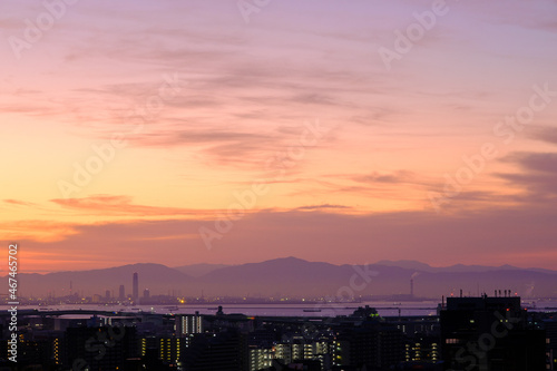 都市の夜明け。日の出とともに空と雲がオレンジ色に染まる。遠くに大阪湾を臨む