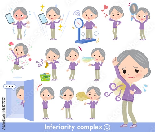 complex, babushka, aged, aged, aged, jersey, exercise, fitness, health, purple, woman, people, stress, presentation, speech, gain weight, weight, diet, fat, slim, bald, hair, smell, stinky, halitosis, foot, breath, sock, perfume, shy, surprised, character, sweet, affinity, vector, illustration