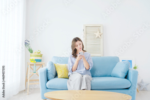 japanese, woman, contemplate, smartphone, home, room, young, couch, visualise, seated, possess, spend, imagination, alarmed, hesitate, apprehension, trouble, recollect, smartphone, cyberspace, online, look, motion picture, search, net, game, app, trade, living room, indoor, lifestyle, asian