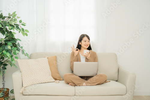 personal computer, woman, couch, cinema, motion picture, search, smile, coffee, couch, look, sideline, app, blog, notebook, telecommuting, contemplate, read, cyberspace, game, room, homemaker, personal computer, pursuit, web, relax, news, relax, work, mail, pajama, vacation, home, seated, house, 30s, asian, japanese, young, people
