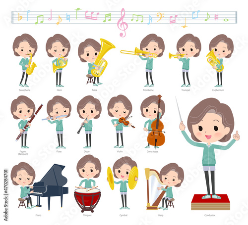 instrument, pursuit, orchestra, middle-aged, 50's, blue green, jersey, exercise, health, woman, people, classic, concert, music, music, performance, fiddle, cello, contrabass, flute, oboe, bassoon, cymbal, kettledrum, piano, harp, trombone, trumpet, saxophone, horn, tuba, director, character, sweet, set, pose, affinity, vector, illustration