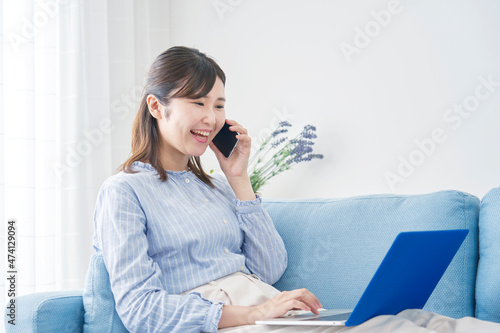 woman, call, home, speaking, personal computer, look, spend, smartphone, young, japanese, smile, smartphone, mobile phone, call, call, wear, drape, conversation, notebook, cyberspace, online, inquire, hear, inquiry, call center, net, smile, living room, room, indoor, lifestyle, indoor, couch, seated, asian, waist up, alone