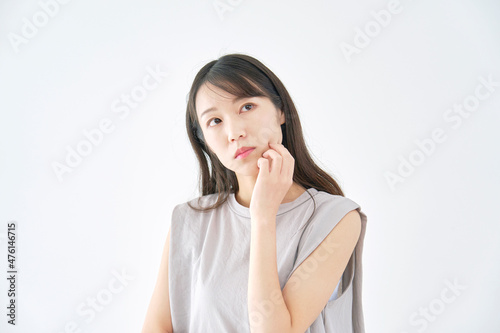 woman, contemplate, visualise, white background, japanese, young, imagination, alarmed, hesitate, apprehension, trouble, recollect, asian, waist up, alone, summer