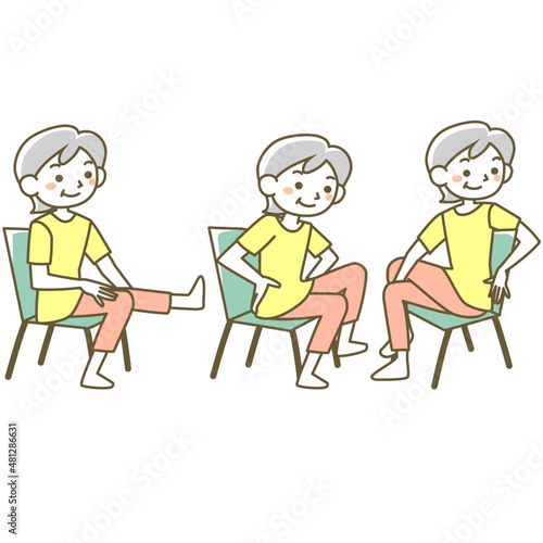 exercise, gymnastics, aged, aged, stretching, chair, muscle, care, woman, nanny, babushka, people, sweet, illustration, vector, japanese, smile