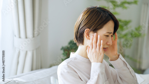 cephalalgia, migraine, woman, people, japanese, asian, middle-aged, 30s, young, homemaker, house, home, head, painful, pain, fatigue, fatigue, overwork, stress, cold, heat, poor health, hangover, arduous, spicey, sluggish, contemplate, trouble, drop, apprehension, unrest, difficulty, negative, sad, depression, menopause, menopause