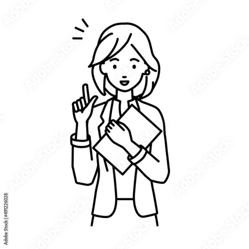 point, hint, flair, business, aware, idea, work, ol, employee, manager, understanding, white background, cut-out, illustration, vector, flat, forefinger, document, board, work, people, woman, 30s, front, waist up, stood, smile, career woman, carrier, jacket, casual, advisory, neck, boss, colleague, secondary, black-and-white