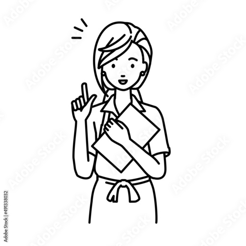 立って書類を手に持って何かひらめいたカフェ店員の女性