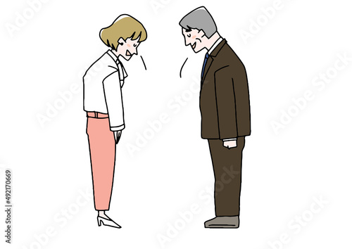 bow, encounter, greeting, two people, please, contract, visit, reception, illustration, vector, ol, uniform, employee, people, woman, sweet, work, occupation, work, career woman, newcomer, business, salaried employee, teacher, lecturer, man, businessman, suit, middle-aged