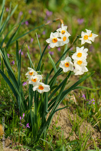 土手沿いに咲くかわいいスイセンの花