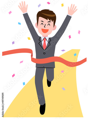 man, businessman, goal, smile, tape, suit, vector, young, illustration, work, waist up, success, business, people, employee, japanese, 30s, achievement, victory