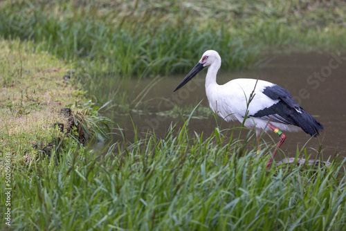 雨のなかたたずむコウノトリ