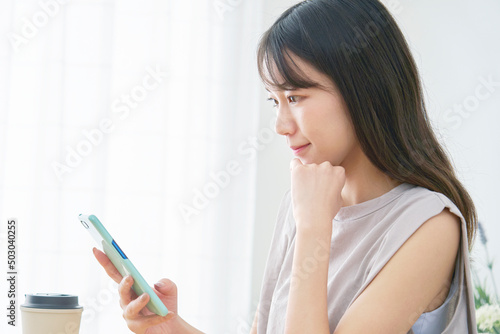 woman, smartphone, smile, young, smartphone, cyberspace, possess, spend, japanese, smile, living room, room, indoor, home, lifestyle, indoor, relax, loosen up, asian, alone, summer, 30s