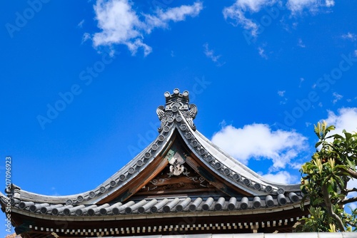 blue skies, landscape, tourist attraction, sunny, building, japan, history, tour tourism, historic site, sky, landmark, showplace, travel, roof, roof tile, roof tile, aged, open air, tile roof, facility, daytime, time, house, house, antique, architecture, retro, material, town, residence, home, vintage, construction, antique, construction industry, image, design, renovation