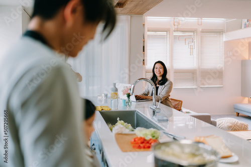 woman, kitchen, family, cooking, sister, grandparent, father, mother, happy, housekeeping, japan, japanese, educated, watch, support, 30s, apron, sink, dining table, window, career woman, couple