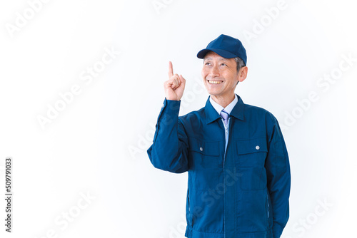 finger, point, attention, factory, working man, business, construction worker, workwear, recommendation, smile, aged, middle-aged, age, white background, refer, employee, office, affirmation, safe, uniform, work, work, manufacture, production, director, man, asian, japanese, chinese, pose, korean, copy space