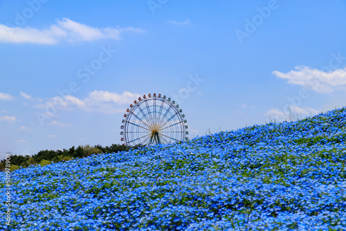 観覧車と満開のネモフィラ畑