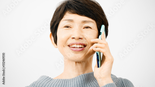 portrait, model, people, person, woman, woman, japanese, japan, asia, black hair, aged, middle-aged, 50's, 60's, alone, solo, smartphone, smartphone, mobile phone, call, call, conversation, prate, speaking, smile, smile, happy, fun, rejoice, positive, chum, friends, family, children, grandchild, calm, peace, close, indoor, natural, copy space, lifestyle, white background