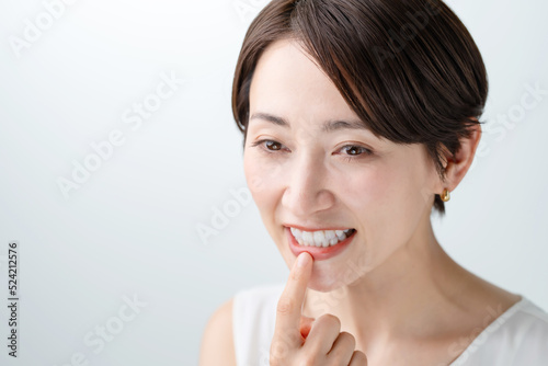 woman, girl, young, teeth, dentition, orthodontia, dental, dentist, 30s, people, mouth, middle-aged, pretty, clean, alone, smile, cary, white, white background, lovely, cosmetic, beauty, japanese, asian, up, closeup, waist up, halitosis, implant, finger, look, redress, plaque, gingivitis