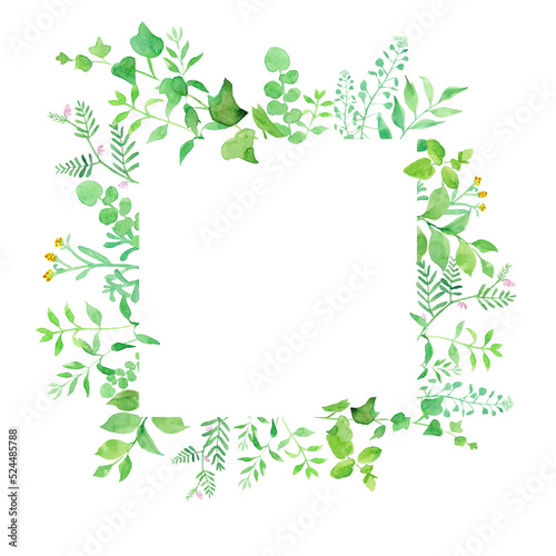 春の草花の水彩イラスト。グリーンリーフの囲みフレーム。スクエア。(透過背景)