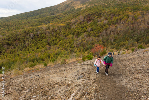 woman, children, people, family, mountaineering, climb, fall, japan, japanese, nature, mountain, trek, hike, outdoors, girl, open air, sunny, mother, two people, lifestyle, mountain, red, yellow, colourful, sweet, volcano, leisure, forest, fun, travel, light, vivid, morning, forest
