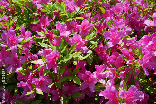 azalea, azalea, flower, lot, flower petals, pink, magenta, bloom, green, chartreuse, leaf, garden, garden, garden, flower, field, spring, april, daytime, nature, open air, japan, kyushu