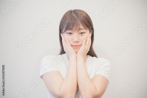 woman, skincare, lifestyle, hand, cheek, care, bare skin, skin, cosmetic, pat, natural, facial, health, young, make-up, student, pretty, beauty, relax, light, make-up, sweet, este, fresh, beauty, portrait, make-up, japanese, touch, asian, face
