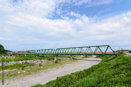 stream, landscape, river, blue skies, bridge, nature, sky, sunny, japan, cloud, open air, tourist attraction, water, tour tourism, rail, cross-linkage, truss, train, countryside, architecture, crossing, signal