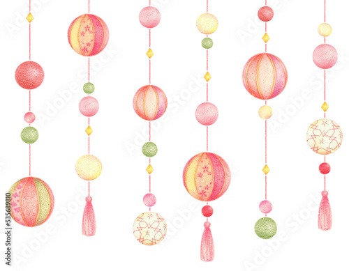 吊るし手毬の飾りのシームレス 手描き色鉛筆画