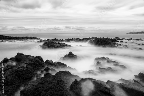 sea, water, beach, coastline, wave, rock, heaven, cloud, monochrome, sunset