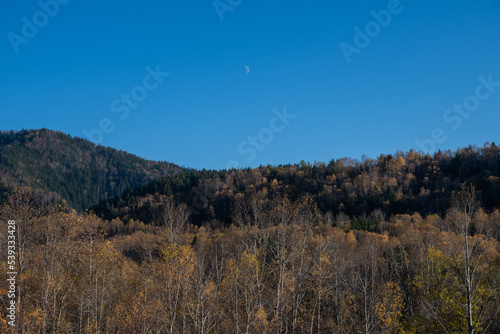 landscape, fall, dusk, evening, sunset, sunlight, sunbeam, leaf, leaf, yellow, yellow, shiny, mountain, forest, sky, blue skies, sunny, moon, wallpaper, background, copy space, card, open air, nature, unmanned, hokkaido, lovely