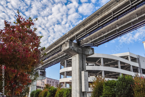 town, monorail, orbit, logistic, building, building, building, blue skies, sky, cloud, environment, tokyo, japan, plant, wood, fall, architecture, blue