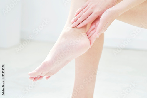 woman, care, skincare, closeup, heel, up, room, young, latex, cream, paint, japanese, 30s, dryness, beauty, cosmetic, asian, house, living room, indoor, home
