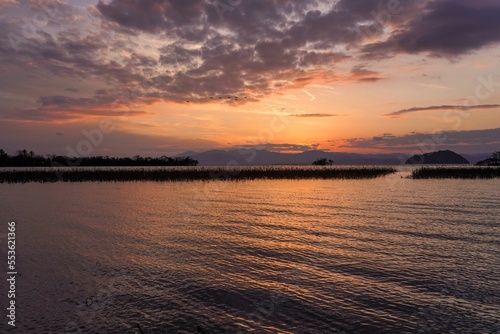 夕焼けに染まる琵琶湖をバックに優雅に飛ぶコハクチョウの群れ@滋賀