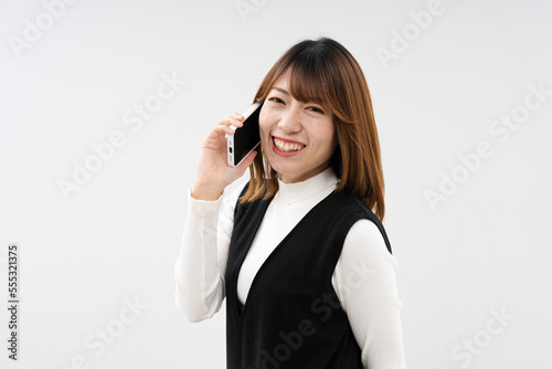 woman, smartphone, text message, mobile phone, business, call, businesswoman, beauty, person, smile, smiling, hair, fashion, face, communication, thought, look, office, studio, hand, model, chat, 1, glamour, happiness, pose, sweet, eye, brunette, holding, speaking, lady, technology, search, make-up, lifestyle