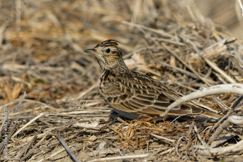 姿勢を低くして寒風に耐えているヒバリ