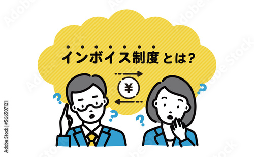 おしゃれでシンプルなインボイス制度の適格請求書と困る・悩むビジネスマンの男女の人物イラストの吹き出しフレームイラスト_青_ベクター素材