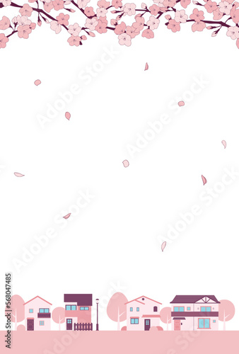 illustration, vector, cherry blossom, spring, town, town, house, house, residential area, building, wood, sakura, sakura, flower, flower petals, new life, spring break, branch, cherry tree, banner, frame, frame, copy space, home, property, life, lifestyle, sweet, pretty, white background, percolation