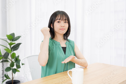 リビングで納得したポーズをする若い女性