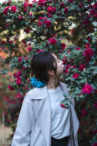 woman, flower, camelia, park, garden, beauty, gardening, outdoors, model, red, nature, happiness, smiling, person, face, lifestyle, 1, rose, wood, pink, fashion, blond, hair, vacation, tour tourism, travel, walk, cosmetic, love, brunette, lady