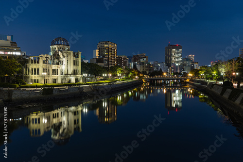日本 広島県広島市にあるライトアップされた原爆ドームと元安川の夜景
