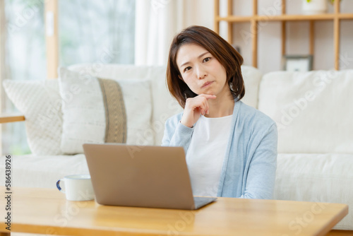 woman, personal computer, notebook, girl, flop, trouble, unrest, contemplate, difficulty, bust, young, alone, mail, cyberspace, net, search, spend, setting, breaker, white, people, window, shopping, indoor, indoor, room, japanese, asian, couch, resent, slow, homemaker, table, table, seated, hesitate, 30s, lying, apprehension, telecommuting
