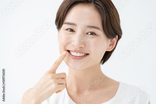 woman, girl, young, teeth, dentition, orthodontia, dental, dentist, 30s, people, mouth, pretty, clean, alone, smile, cary, white, white background, lovely, cosmetic, beauty, japanese, asian, up, closeup, waist up, halitosis, implant, finger, show, redress, plaque, gingivitis, health, woman