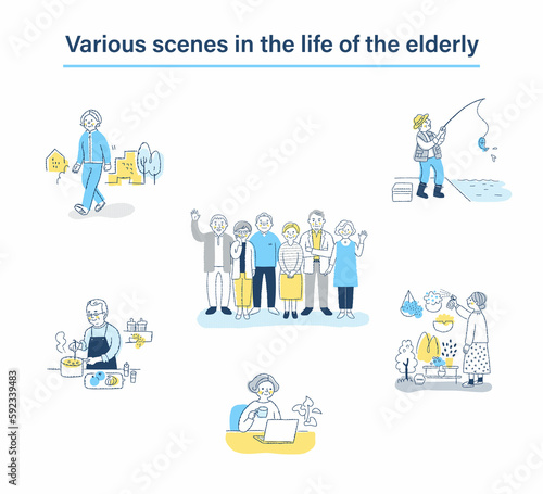 people, illustration, set, variation, pursuit, plural, smile, white background, couple, aged, aged, woman, man, health, positive, second life, elderly, lively, lifestyle, fun, leisure, flower, set, dish, cooking, kitchen, gardening, garden, gardening, fishing, fishing, walk, exercise, walking, jog, 60's, notebook