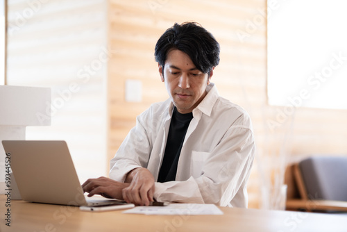 japanese, man, work, adult, businessman, personal computer, notebook, typing, shirt, black hair, solemn, waist up, indoor, living room, house, smartphone, spring, daytime, business, table, document, man, 1, person, computer