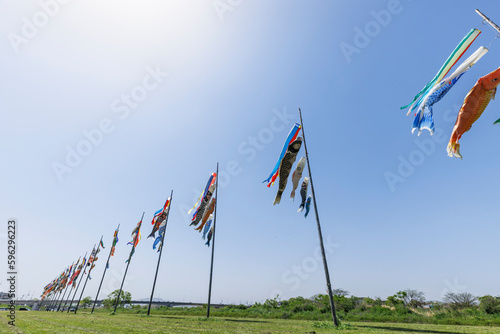 風になびく遠賀川河川敷の鯉のぼり