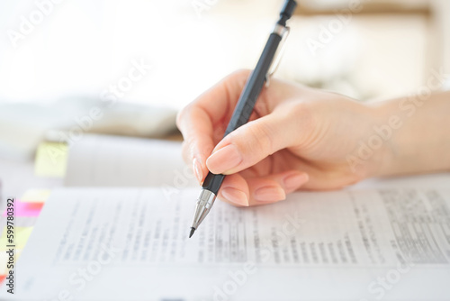テキストを使って勉強する女性の手元
