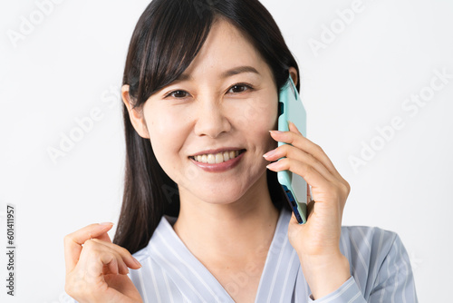 portrait, people, person, woman, woman, japanese, japan, young, 30s, shirt, stand, mobile, mobile phone, call, smartphone, smartphone, call, conversation, contact, smile, joyful, rejoice, positive, expression, cyberspace, online, indoor, indoor, white background, copy space, white