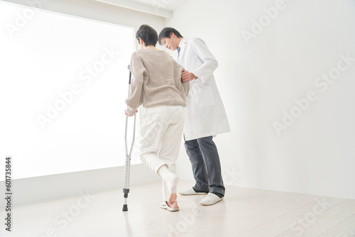 woman, doctor, middle-aged, fracture, crutch, spend, foot, walk, bandage, rehabilitation, injury, ankle, man, exercise, hospital, cuddle, doctor, japanese, sprain, asian, walk, aged, 50's, medical care, orthopedics, surgery, indoor, indoor