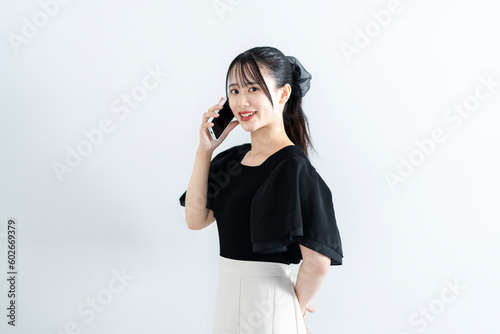 woman, mobile phone, smartphone, office, computer, tablet, communication, call, chat, make-up, coiffure, hair, technology, model, student, teenage, skin, beauty, style, face, person, smile, business, smiling, lady, 1, fashion, shirt, brunette, studio, look, hand, up, happiness, eye, lifestyle, standing, glamour, lip, dress, japanese, pose, jean, elegant, sweet, home, cool, work, businesswoman