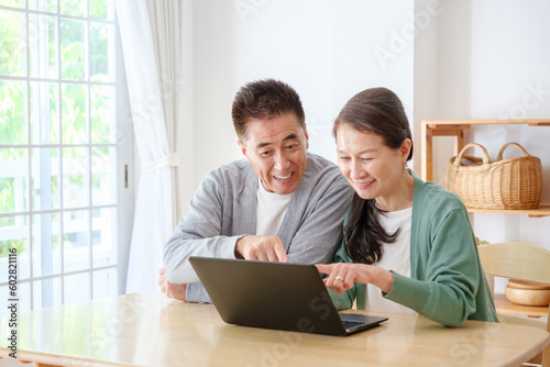 personal computer, notebook, man, woman, aged, couple, family, aged, personal computer, spend, operation, pursuit, cyberspace, net, online, indoor, indoor, living room, lifestyle, live, enjoy, fun, look, attention, smile, 60's, chum, partner, house, window, two people, plural, japanese, asian